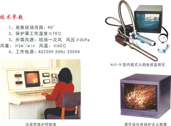 HJY-Ⅳ型內(nèi)窺式火焰電視監(jiān)視儀是用于監(jiān)測爐內(nèi)照度較低的循環(huán)流化床鍋爐及垃圾焚燒爐爐內(nèi)物料狀態(tài)的彩色工業(yè)電視系統(tǒng),該產(chǎn)品是我公司技術(shù)人員與光學(xué)研究所部分科技人員專門針對循環(huán)流化床鍋爐和垃圾焚燒爐而共同開發(fā)研制的,只要光照度大于10LUX的環(huán)境條件即能清晰成像,在國內(nèi)處于領(lǐng)先地位。對于循環(huán)流化床鍋爐,因為爐內(nèi)為密封狀態(tài),在點火及投料過程中極易造成高溫或低溫結(jié)焦,而爐內(nèi)照度又很低,用國內(nèi)現(xiàn)有的爐膛火焰監(jiān)視裝置看不到爐內(nèi)物料狀態(tài)。如采用HJY-Ⅳ型產(chǎn)品可看到爐內(nèi)物料狀態(tài)并指導(dǎo)投料并及時發(fā)現(xiàn)結(jié)焦趨勢,從而避免結(jié)焦或投料過多造成點火過程中滅火。而垃圾焚燒爐,由于污染問題,爐體為密封式,投料后極易將火壓滅,即使在燃燒時,爐內(nèi)照度也非常低,通常在300LUX以下,而國內(nèi)常規(guī)產(chǎn)品需在500LUX照度下才能工作。所以只有采用HJY-Ⅳ型產(chǎn)品,才能指導(dǎo)投料及探針插孔并在遠(yuǎn)離現(xiàn)場的操作室內(nèi)清晰看到爐內(nèi)的垃圾焚燒狀態(tài),從而實現(xiàn)安全經(jīng)濟運行。